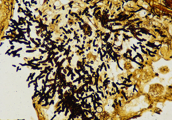 染色原理:标本经高碘酸等氧化剂氧化后,使真菌和其他机会性生物的细胞壁内的粘多糖以及组织基底膜内的多糖暴露出醛基,醛基将六胺银还原为黑色的金属银,从而使真菌、基底膜等被染成黑色。硫代硫酸钠对已显色的银盐起固定作用,并除去未反应的银离子。